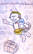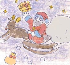 そしてサンタは空からプレゼントをたくさん街に向かって投げています。